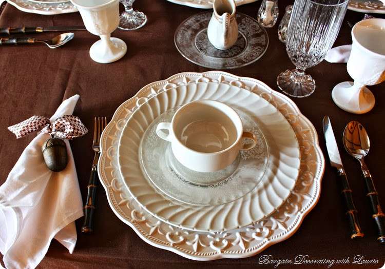 Beautiful table Laurie. I love how elegant it is. Charming white with rich browns is a winner. You have the beautiful pieces. The acorn is lovely tied to the napkin. Love the milk glass. Happy Sunday to you.