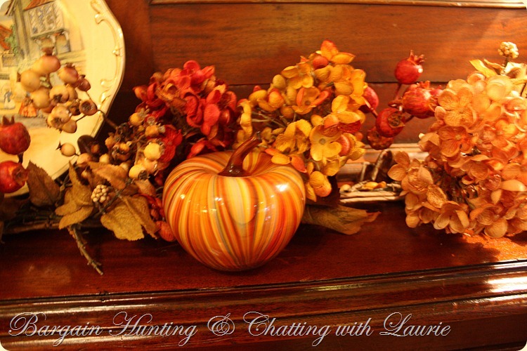 Love the glass pumpkin and pear! Thank you for inspiring me to get off my wide load to put something out!! If you can believe it, I still have an Easter bunny still waiting to go to the garage, but I have to clean the garage to get to the container. Hoarders....can't do anything with them!